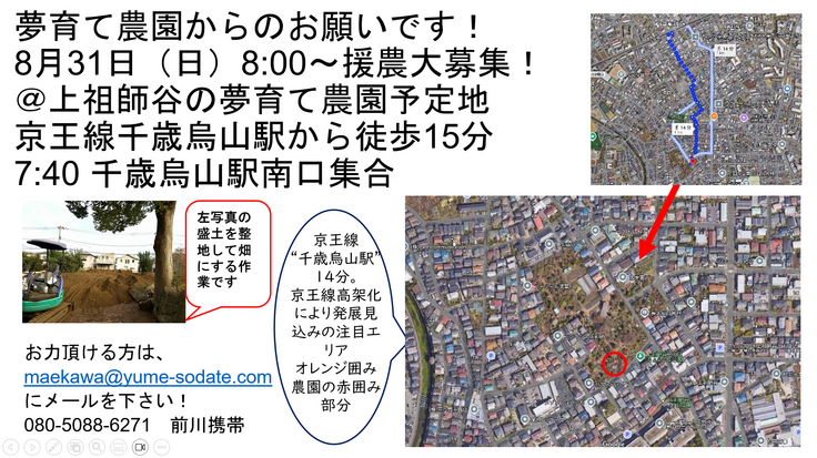 夢育て農園は、京王線千歳烏山駅から徒歩15分の上祖師谷地区に、新たに農園を設けます。この農園開設のため、8月31日(日)に援農を募集しています!是非、前川までご連絡ください!!maekawa@yume-sodate.com 080-5088-6271