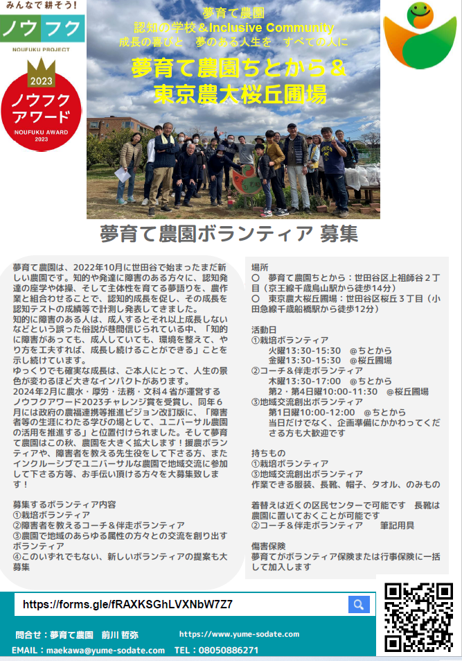 夢育て農園はボランティアを募集しています!是非、お力を下さい!!よろしくお願いします!