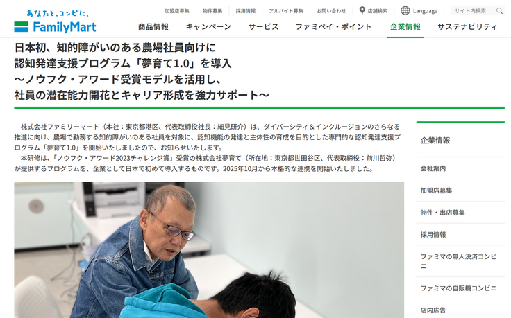 企業として日本初(恐らく世界初)で、株式会社ファミリーマートが、知的障がいのある社員の潜在能力開花とキャリア形成を強力にサポートするため、認知発達支援プログラム「夢育て1.0」を導入された旨のプレスリリースがでました。是非、是非、ご一読下さい!!