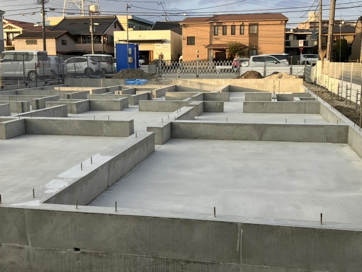 基礎工事が終わり基礎の枠組みを見ながら、