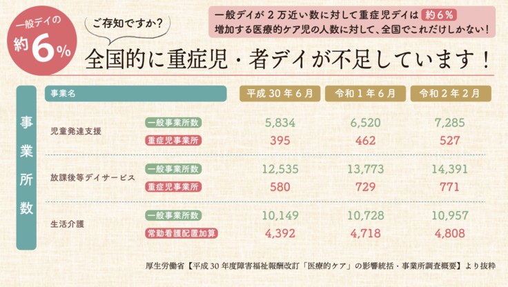障害のある子どもが通う一般の通所支援事業所が2万ヶ所以上ある一方で、主に重症児を対象とした事業所の数はその約6%程度です。