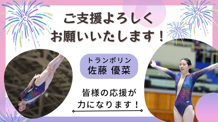 トランポリン競技 佐藤優菜 所属 FIPS/CRAZY-TRAMPOLINE 競技歴 24年 主な成績 世界選手権出場、ワールドカップメダル獲得、全日本選手権2位