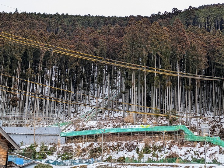そのため、現在行われているこの工事は、ここに4つの集水用の井戸をボーリングするなど地滑り防止工事になります。(再来年(2025年)には工事が終わる予定とのこと)