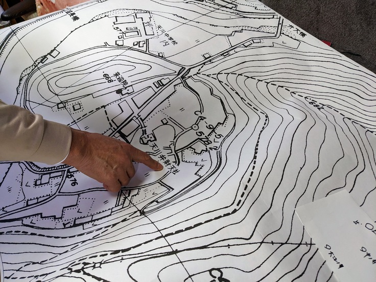 そうした中で、あらためて坪内の地形図を広げながら、過去の情報を聞いてみると、井戸があった場所がきちんと水脈に沿って作れられていたことや、埋め立てされてしまったが池があった場所や、川がこの坪内の中に巡っていたという話など、今の坪内の姿からはまた想像ができない古の姿を垣間見ました。