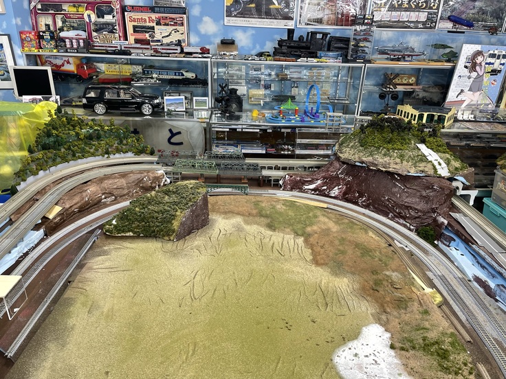 現在、2期工事に差し支えない部分からジオラマ制作を進めており、東側のトンネルと崖が少しずつ形になってきております。