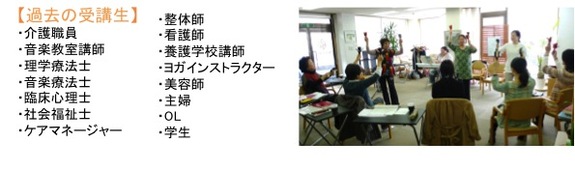 楽リハビリ研修(音楽リハビリ指導員養成講座)は地域に住まれる高齢者に対して「音楽を通じて健康と生きがいづくり」を支援するための方法を学びます。地域福祉や介護予防、高齢者の心身や疾患、音楽の持つ力について2日間12時間で学びます。