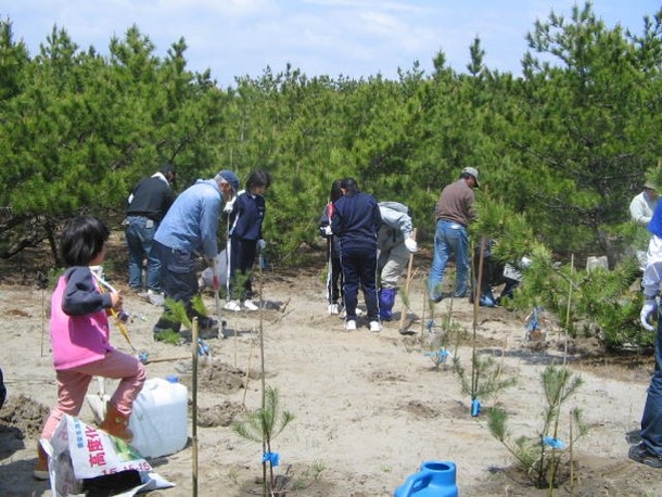 皆様、こんにちは。ゆりりん愛護会代表の大橋信彦です。不審火がもとで焼失してしまった宮城県名取市閖上(ゆりあげ)海岸のマツ林の再生と、「地域の自然を守り愛するこころ」、「地域に奉仕するこころ」を持った子どもたちを育成することを目的に、平成18年4月、ゆりりん愛護会は誕生しました。