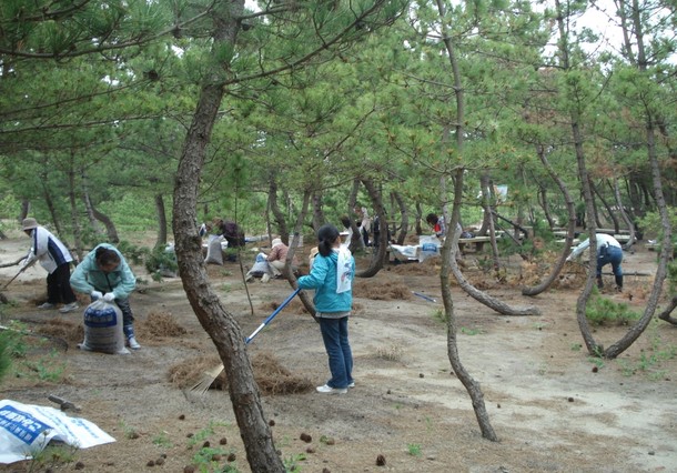 私たちは、焼失したマツ林を再生するため、クロマツをはじめとする樹木の苗8種、1,300本を地元の小中学生と一緒に植えました。荒れていた周囲のマツ林の整備にも努め、マツ林は見違えるように美しくなりました。しかし、平成23年3月11日、突如やって来た東日本大震災により、まちも海岸も壊滅的なダメージを受けました。共に汗を流した仲間も、7名がその犠牲となりました。