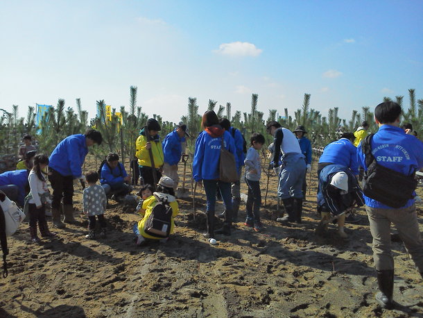 「復興植樹祭」と銘打って行われたマツの移植会には、情報労連宮城県協議会の皆さんが家族連れで参加してくださいました。この日は好天に恵まれ、予定した100本の若樹はしっかりと海岸に植えられました。それに先立ち、ゆりりん愛護会は10月、宮城県と協定を結び、0.2ヘクタールの植栽地に計1,500本のマツを植えることにしておりました。その内の100本が11月3日にボランティアの手で植えられたのです。