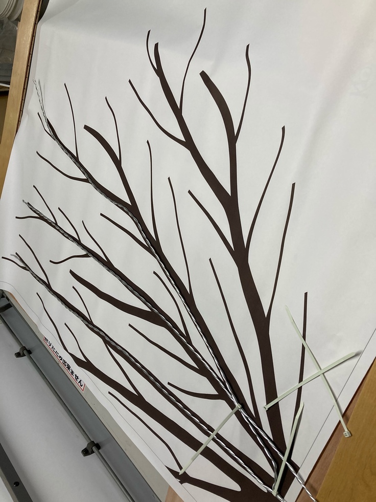 現在はグループのシンボルツリーである桂の木をモチーフにしたデザインの木を作成中で、幹部分の骨組みを手作業で行っています。
