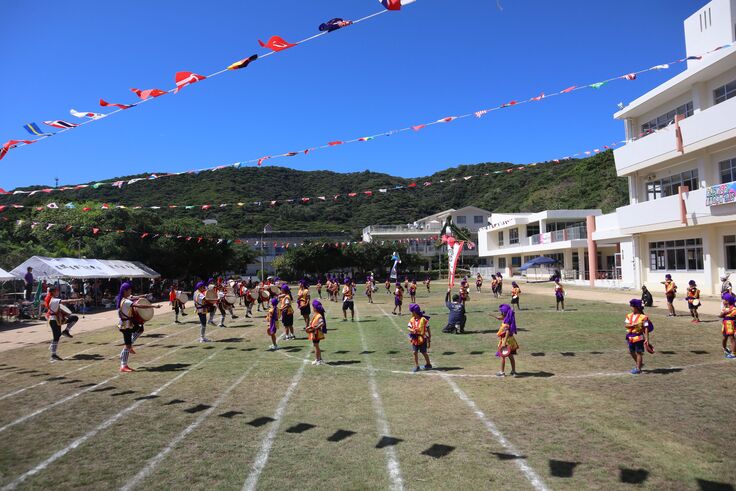 10月4日(土)には、座間味小中学校の運動会がありました。クジラ組(幼稚園年長)から中学3年生までバトンをつなぐ「縦割班リレー」や小学校全学年で取り組んだ「組体操」、小中学生で踊ったエイサーなど、子供たちの活躍を会場の保護者・地域の皆様に届けることができました。