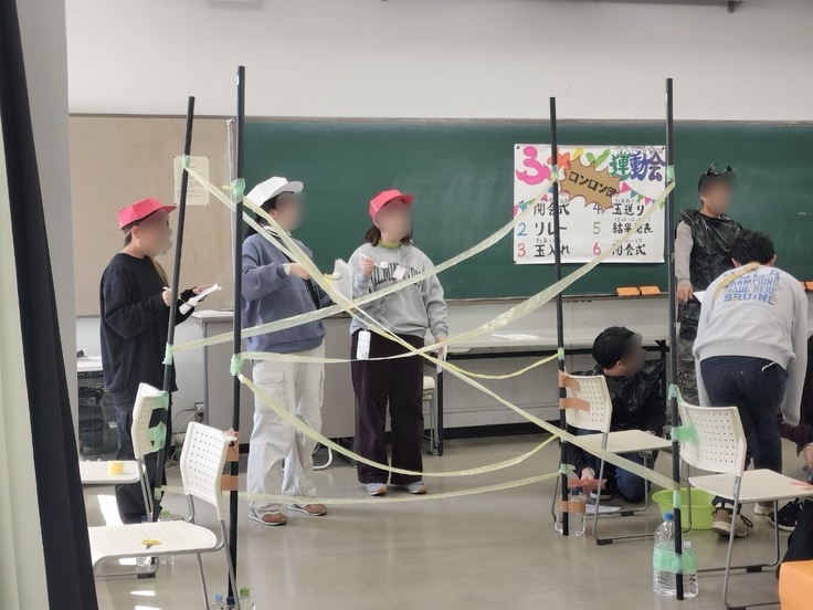 障害物リレー:キャタピラ、ピンポン玉運び、クモの巣くぐり、ボールあてをクリアしていく
