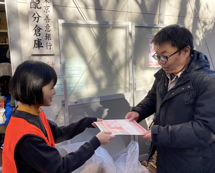 12月13日と15日、企業・団体様からの寄贈品お渡しの際、受取りに来られた福祉施設へ、東京善意銀行職員がクラウドファンディングのチラシを配布し、拡散と協力をお願いしました。