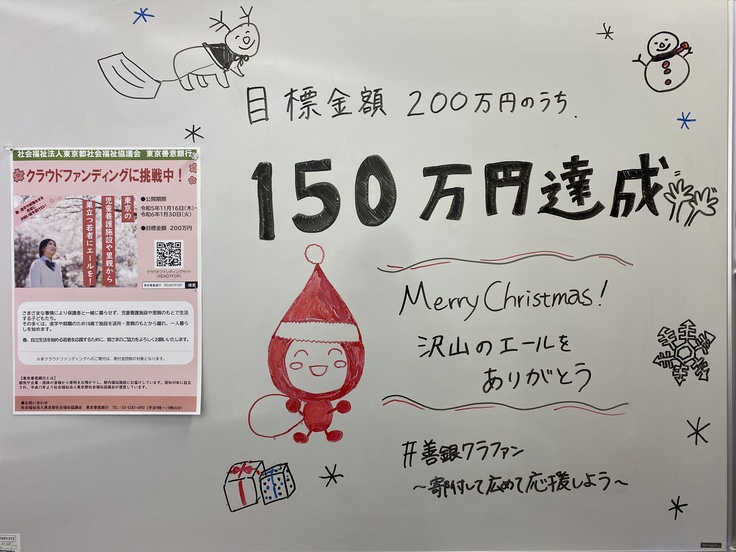 目標達成まであと50万円。年末年始でも気を緩めず、職員一同頑張ってまいりますので、引き続き皆様のあたたかいご協力をよろしくお願いいたします。