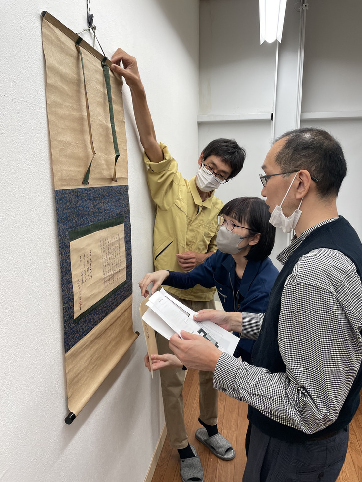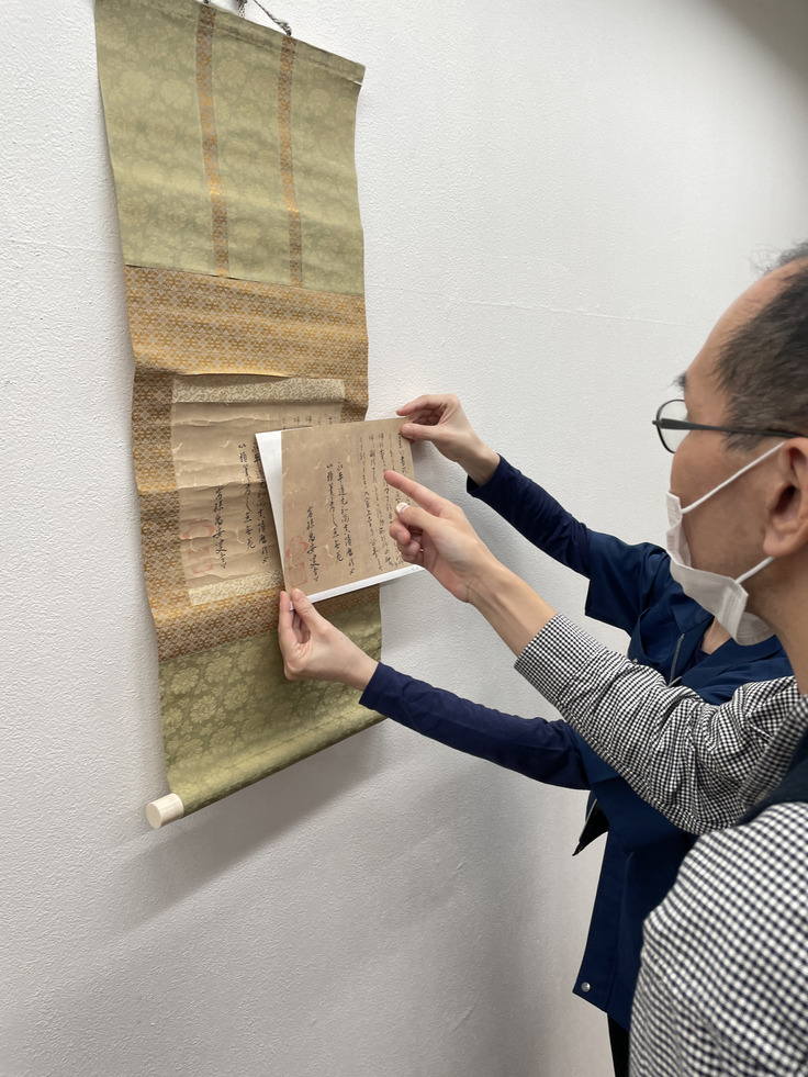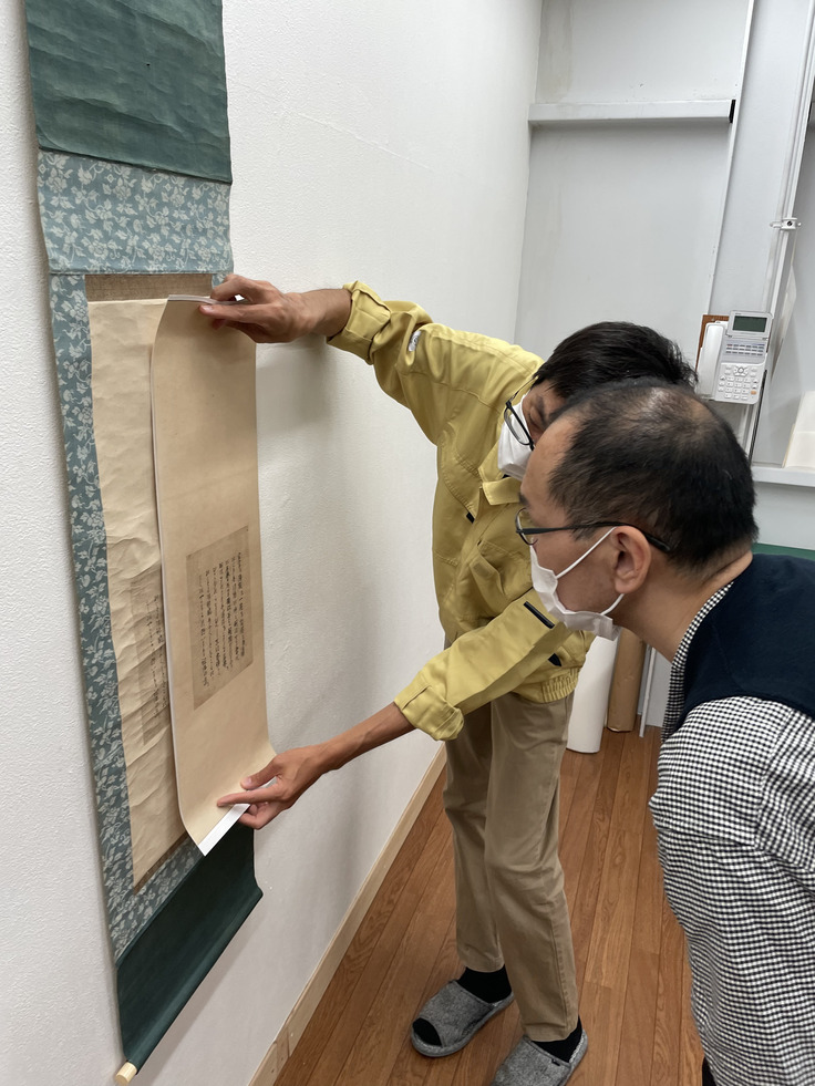 本紙部分の調整が終了し、今後は裂(きれ)の選定を行い、表装作業に移ります。