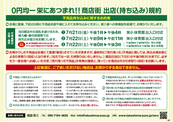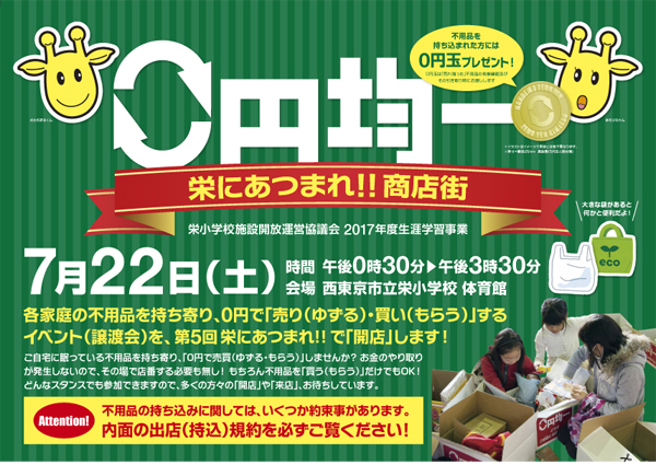 本日、7/22(土)午後0時30分〜午後3時30分、西東京市立栄小学校体育館にて「0円均一 栄にあつまれ!!商店街」が「開店」します。不用品の当日受付も行っていますので、どうぞお気軽にお越しください。(もちろん「買う(もらう)だけでもOKです。)