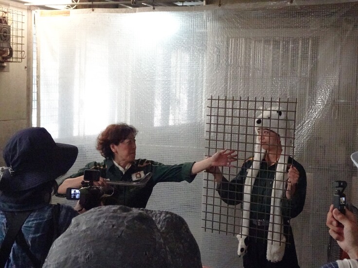 まず初めに担当者がホッキョクグマ役の職員を例に給餌の注意点をわかりやすく説明して、いよいよ獣舎の見学です。
