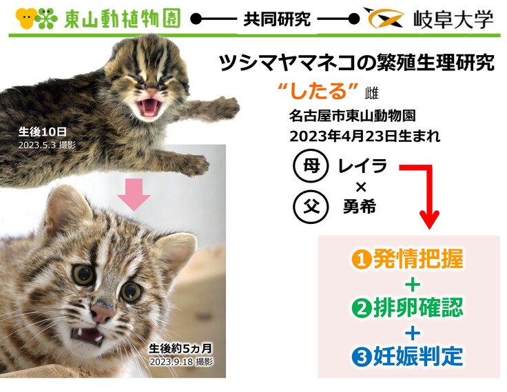 ”したる”の誕生にあたり,母親”レイラ”の繁殖生理研究に関わらせていただきました。発情の把握,排卵の確認,妊娠判定などです。環境省のツシマヤマネコ保護増殖事業の一環として,日本動物園水族館協会や東山動物園,岐阜大学動物繁殖学研究室の共同研究として実施しています。