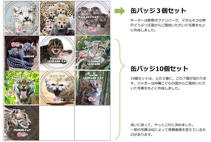 ●缶バッジ3個セットまたは10個セットの内容はこんな感じです。