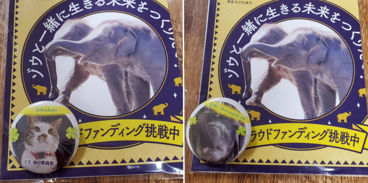本日16日(火)から、当園のおみやげショップでお買い物された方に「サバチョビCF実行委員長ミニ缶バッチ」または「結希生後5ヶ月ミニ缶バッチ」がついたクラウドファンディングのチラシを配布します!!