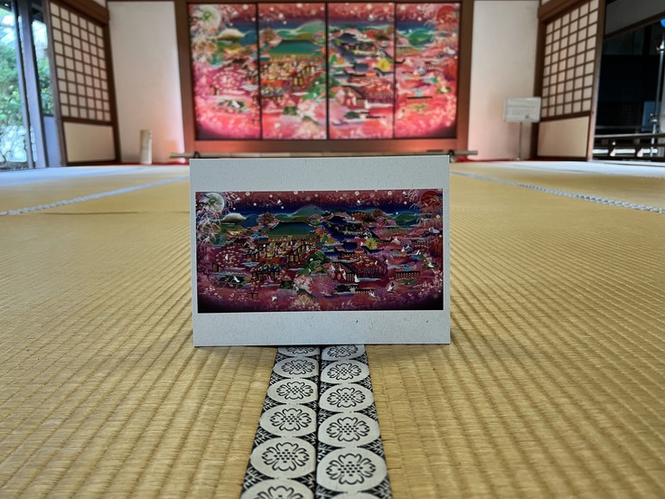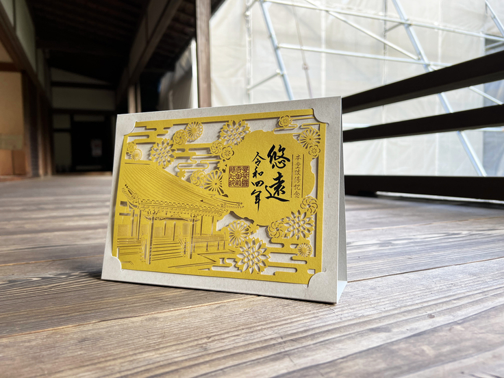本堂を切り絵にしたデザインになっており、飾ることもできる台紙も封入しております。台紙の方は裏がだるま商店の『極彩色梅匂小町絵図』になっています。