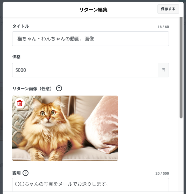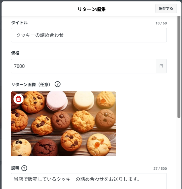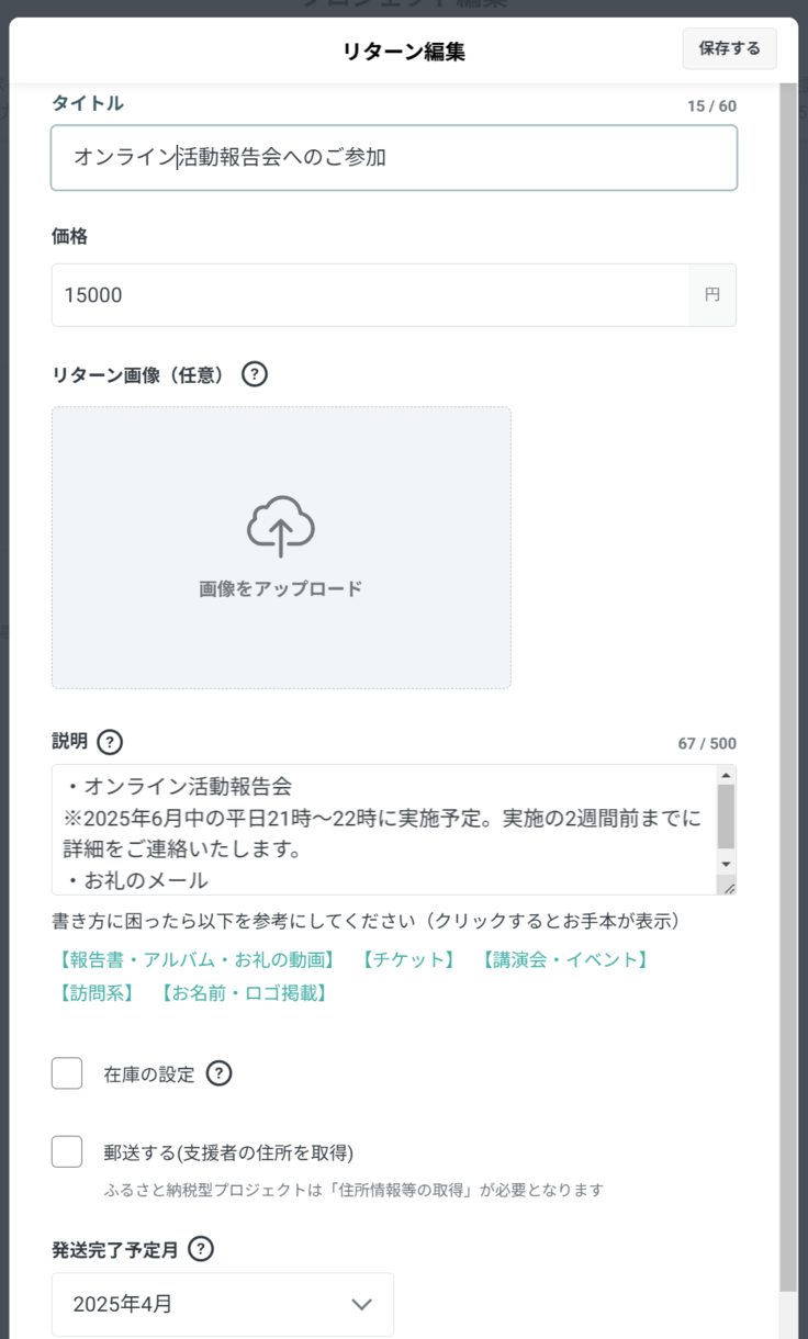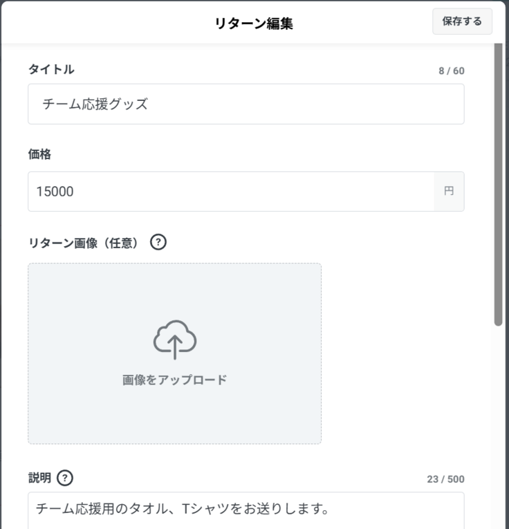 ※公開後のリターン追加は、既に設定済のリターンよりお得なものを設定できませんのでご注意ください。